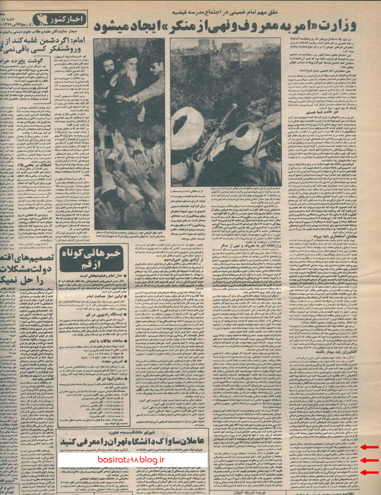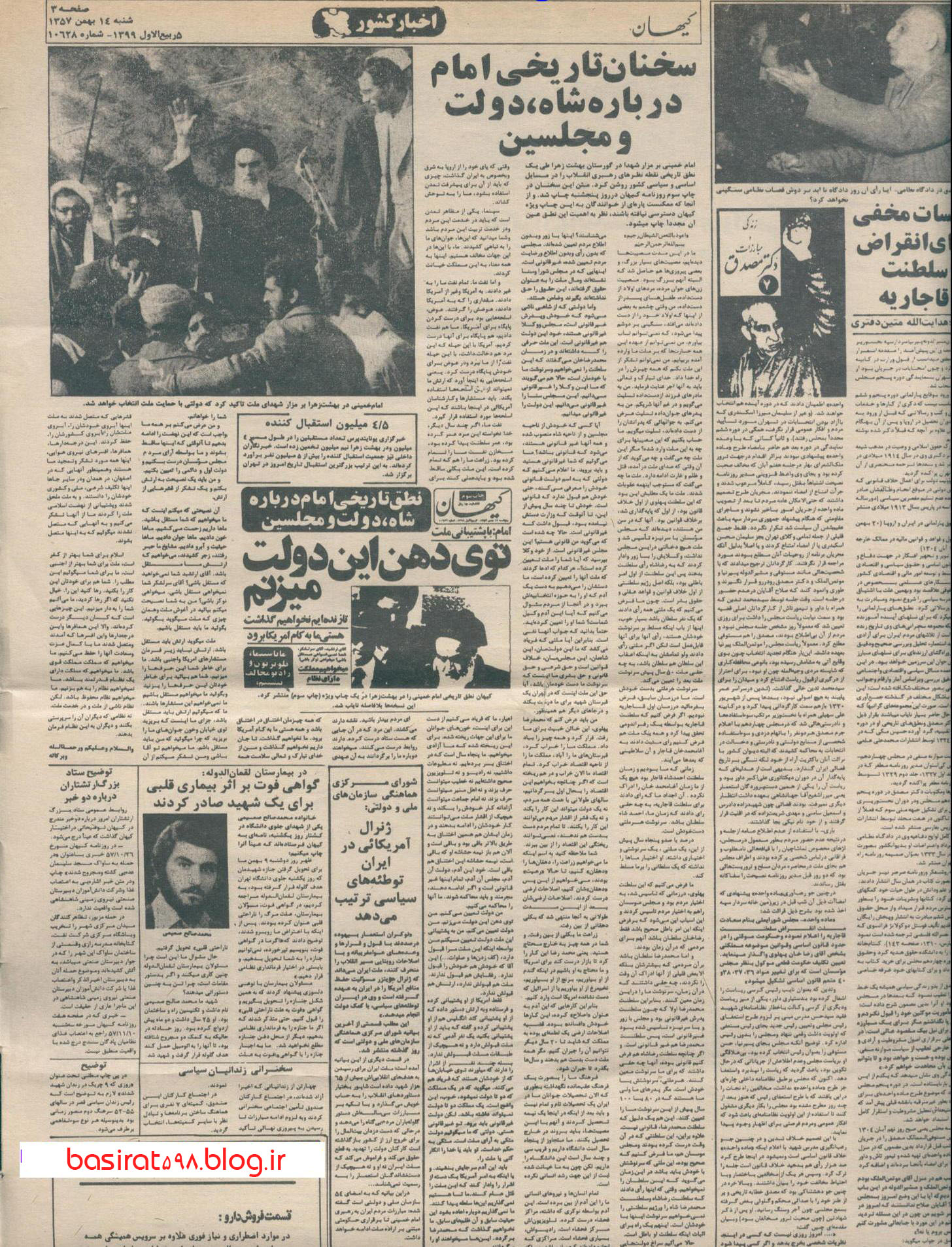 متن کامل سخنرانی امام در 12 بهمن 57، انعکاس آن در 14 بهمن در روزنامه کیهان